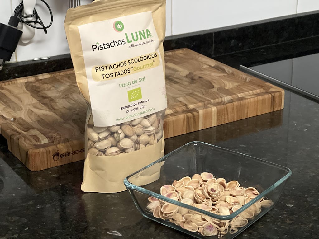 Porque llegan más frescos y con trazabilidad total. En Pistachos Luna cultivamos, procesamos y envasamos en origen, reduciendo la huella de carbono y apoyando al campo español. Además, nuestra finca está en el Geoparque de Granada, con un microclima que potencia sabor y textura, y contamos con certificación ecológica y registro sanitario 21.036232/GR.